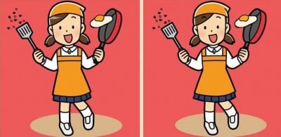 Abiejuose piešiniuose pavaizduota mergaitė, gaminanti kiaušinienę. Ir atrodo, kad ji turi bėdų, nes iš keptuvės ant grindų tuoj nukris kepamas kiaušinis.