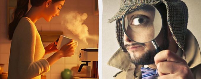 Toliau pateiktame jaukiame paveikslėlyje matote merginą, kuri erdvioje virtuvėje ruošia sau kavą. Iš pirmo žvilgsnio atrodo, kad viskas normalu, tačiau galima rasti vieną loginę klaidą.