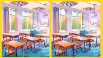 Paveikslėlyje pavaizduota mokyklos klasė, o jūs turite vos 12 sekundžių surasti keturis skirtumus šiuose dviejuose paveikslėliuose. Ši vizinė užduotis patikrina jūsų stebėjimo, dėmesio ir susikaupimo gebėjimus esant stresui ir laiko trūkumui.
