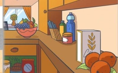 Paveikslėlyje pavaizduota įprasta virtuvė. Matai spintelę, ant stalo pastatytą vazą su vaisiais ir kitus daiktus. Mūsų užduotis – surasti, kur yra ananasas.