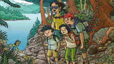 Paveikslėlyje pavaizduota moteris ir jos vaikai gamtoje. Atrodo, kad jie fotografuoja. Taip pat kažkur netoliese yra pasislėpusi gyvatė, kurią reikia surasti.