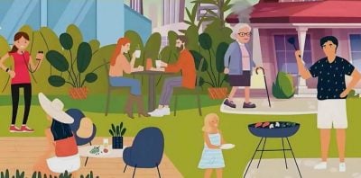 Pažvelkite į toliau pateiktą paveikslėlį. Jame pavaizduota lauko vakarėlio scena. Paveikslėlyje pavaizduoti žmonės leidžia laiką atsipalaidavę, kalbasi ir kepa šašlykus.