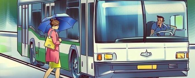 Paveikslėlyje matome į autobusą įlipančią moterį. Lauke oras lietingas, todėl ji laiko skėtį, kad apsisaugotų nuo kritulių.