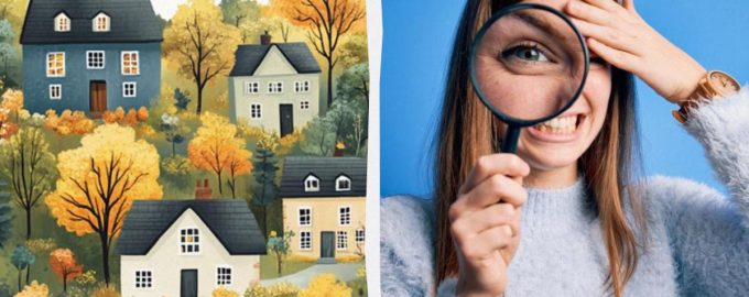 Žemiau matysite gyvenamojo rajono su jaukiais namais ir spalvingais medžiais vaizdą. Tavo užduotis – tarp šio grožio surasti eršketus.